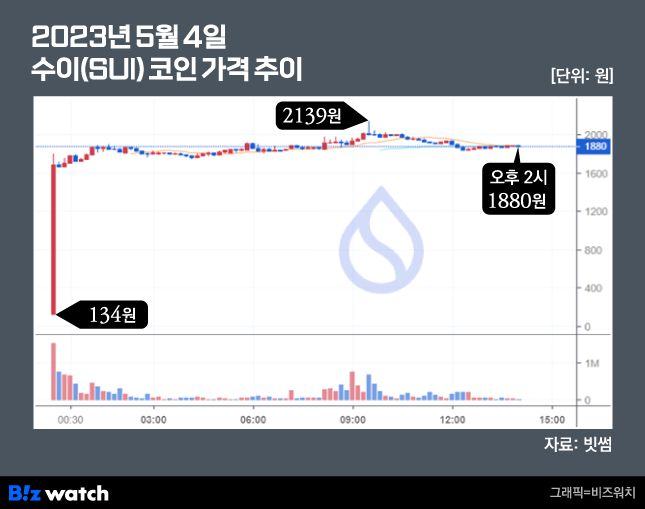 4일 오후 각 거래소에 따르면 수이는 2000원 안팎에서 등락을 반복하며 안정세를 보이고 있다. 하지만 전날 밤 상장 직후 수이는 최고 1500% 이상 급등하는 등 과열 양상을 띠었다. 전날 자정 상장한 빗썸에서는 기준가 133.6원에서 이날 오전 최고가 2139원까지 올랐고, 코인원에서는 기준가 133.9원에서 전날 밤 10시 상장과 동시에 최고가 3000원을 기록했다.