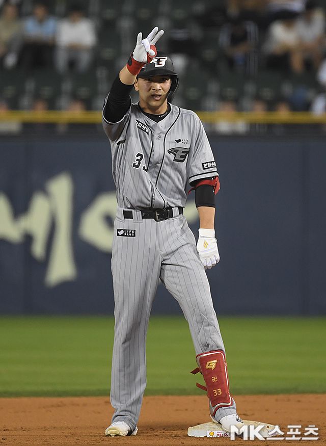 8회초 1사에서 한화 유로결이 2루타를 친 뒤 세리머니 하고 있다.