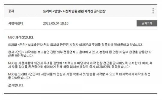 그러면서 “시청자들의 의견과 우려를 감안해 1차적으로 해당자의 제작 현장 접근을 금지하도록 조치한 데 이어 혹시 모를 참여를 원천적으로 배제하기 위해 해당 업체와 계약도 즉시 해지하기로 결정했다”며 “‘연인’이 시청자들의 관심과 사랑 속에서 첫 방송을 시작할 수 있도록 마지막까지 제작에 최선을 다하겠다”고 덧붙였다.