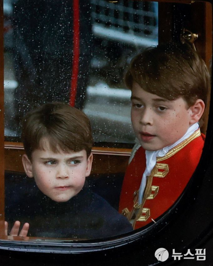 [런던 로이터=뉴스핌] 권지언 기자 = 6일(현지시각) 찰스 3세 영국 국왕 대관식에 참석한 조지 왕자(오른쪽)와 루이 왕자(왼쪽)가 서로 다른 표정을 짓고 있다.  2023.05.06 kwonjiun@newspim.com