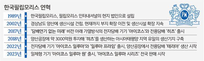 1847년 영국 런던 본드가에 문을 연 담배 가게로 시작한 필립모리스인터내셔널(PMI)은 1972년 이래 50년 넘게 ‘말보로’로 세계 판매 1위를 기록하고 있다. 한국필립모리스는 2016년 ‘담배연기 없는 미래’라는 비전을 앞세웠고 2017년에는 궐련형 전자담배(담뱃잎이 포함된 전용 스틱을 기기에 꽂아 가열하여 증기를 흡입하는 방식의 전자담배)를 한국에 처음 선보이고 시장을 선도했다.