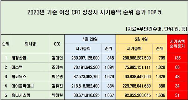 최근 한주 새 여성 CEO가 활약하는 주식종목의 시총 순위에도 다소 변화가 있었다. 시총 순위가 비교적 많이 오른 곳은 태경산업인 것으로 나타났다. 이 주식종목의 지난달 28일 시총 규모는 2309억원으로 시총 순위 845위였는데, 이달 4일에는 2808억원을 기록하며 709위로 한주 새 136계단이나 순위가 전진했다.