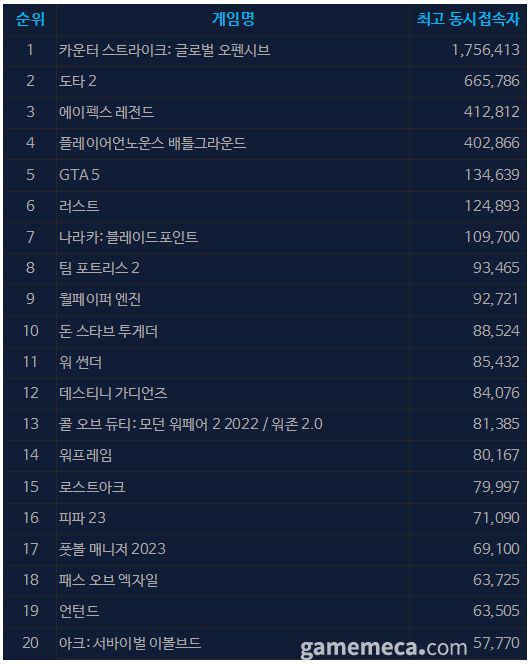 일 최고 동시접속자 TOP 20에서는 10만 명대를 유지하던 돈 스타브 투게더 동시접속자 수가 8만 8,524명으로 줄어 10위로 내려갔다. 콜 오브 듀티: 모던 워페어 2 2022는 전일 대비 약 1만 5,000명 감소한 8만 1,385명으로 13위를 기록했다.