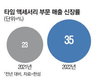 실제로 타임은 액세서리 부문의 전년 대비 매출 신장률이 2021년 23%, 2022년 35%를 기록하며 연속 두 자릿수 성장을 이어왔다. 같은 시기 타임의 전체 매출 신장률이 2021년 13.9%, 2022년 15%임을 감안하면 액세서리 부문의 성장세가 더욱 돋보인다.