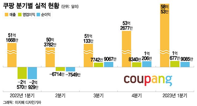 쿠팡은 9일(현지시간) 1분기 영업이익이 1362억원(1억677만달러)를 기록했다고 발표했다. 3분기 연속 흑자 행진이다. 분기 영업이익 1억달러 돌파는 이번이 처음이다. 매출은 전년 동기 대비 20% 늘어난 7조3990억원(58억53만달러, 분기 환율 1275.58원 적용)을 기록했다. 역시 최대 실적이다. 달러 기준으로는 13% 증가했다. 국내 온라인유통업체들의 1분기 평균 매출 신장률 7.7%를 뛰어넘는 성장이다. . 미국 월가의 예상치 56억달러도 크게 웃돌았다.