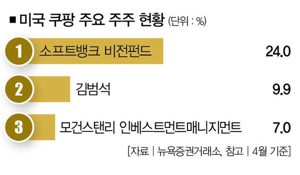 지난 4월 기준으로 쿠팡의 1대 주주는 지분율 24.0%의 소프트뱅크다. 김 의장이 지분율 9.9%로 2위, 미국 투자은행 모건스탠리가 7.0%로 3위다. 김 의장은 차등의결권이 부여된 클래스B 주식을 소유해 의결권은 70% 이상인 것으로 알려졌다.