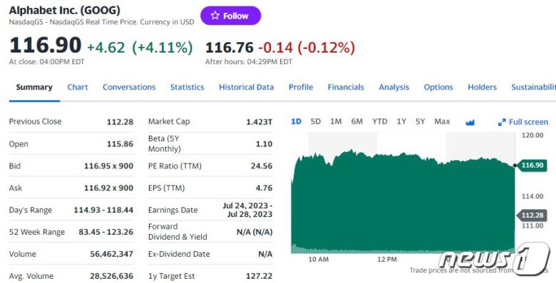알파벳은 전일에도 4.02% 급등한 112.28 달러를 기록했었다. 연일 급등세를 이어가고 있는 것.