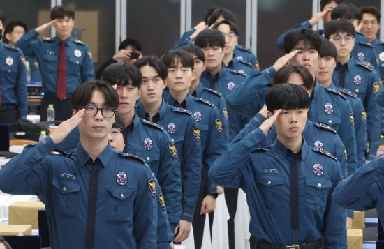 의무경찰 마지막 기수 대원들이 지난달 14일 서울 서대문구 경찰청에서 열린 대한민국 의무경찰 1142기 합동 전역식에서 경례하고 있다. [이미지출처=연합뉴스] |
