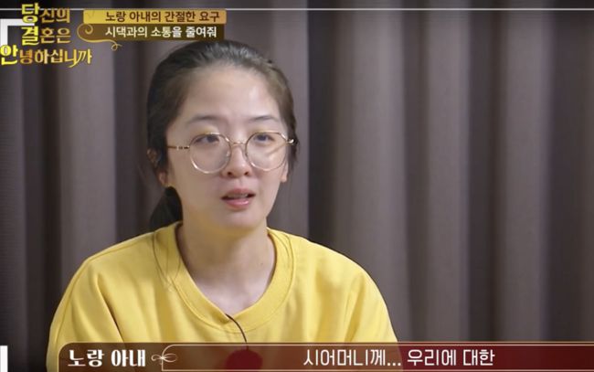 하지만 노란옷부부에게도 속사정이 있었다. 노란 옷 아내는 “행복한 결혼 꿈꿨는데 서로 지친다 시댁도 자주가는 상황. 하루종일 예민해져 있어 탈출구가 없었다”며 토로했다. 그러면서 남편에 대해선 “시댁에 시시콜콜한 얘기 안 했으면 좋겠다아들을 향한 시어머니 사랑이 극진하다, 시어머니와 같이 사는 느낌, 너무 자주 만난다 선이 있어야겠단 생각, 연을 끊는게 아닌 적절한 거리가 필요하다”고 했다.