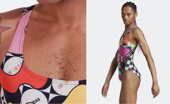 아디다스가 지난 15일 내놓은 '프라이드 2023' 컬렉션의 여성 수영복 모습. 남성으로 보이는 모델이 새 수영복을 선보이고 있다. 사진 아디다스 홈페이지 캡처