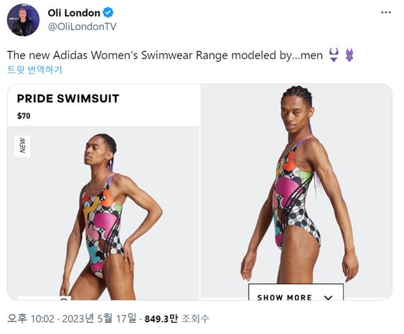 이 수영복 외에도 아디다스는 'Pride 2023' 컬렉션에서 여러 여성복 제품을 남성 모델에게 입힌 사진을 공개했다.