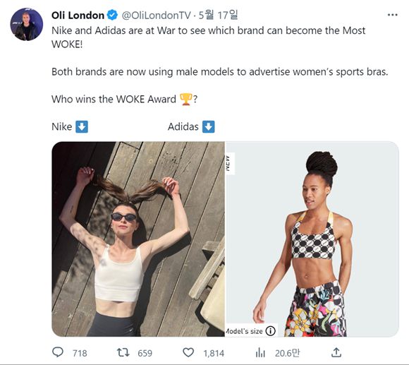 아디다스가 이런 논란을 겪은 것은 처음이지만, 패션 업계에서 이러한 논란이 처음은 아니다. 나이키 역시 여성용 의류 모델로 남성을 기용해 논란을 일으킨 바 있다. 이를 두고 영국의 인플루언서 올리 런던은 "나이키와 아디다스가 '가장 깨어있는 브랜드'를 두고 전쟁 중"이라며, "누가 'WOKE(깨어있는) 어워드'를 차지하게 될까?" 하고 비꼬는 트윗을 올렸다. 올리 런던은 이전에 스스로 트랜스 인종, 젠더 중립, 트랜스젠더라고 밝힌 바 있다.