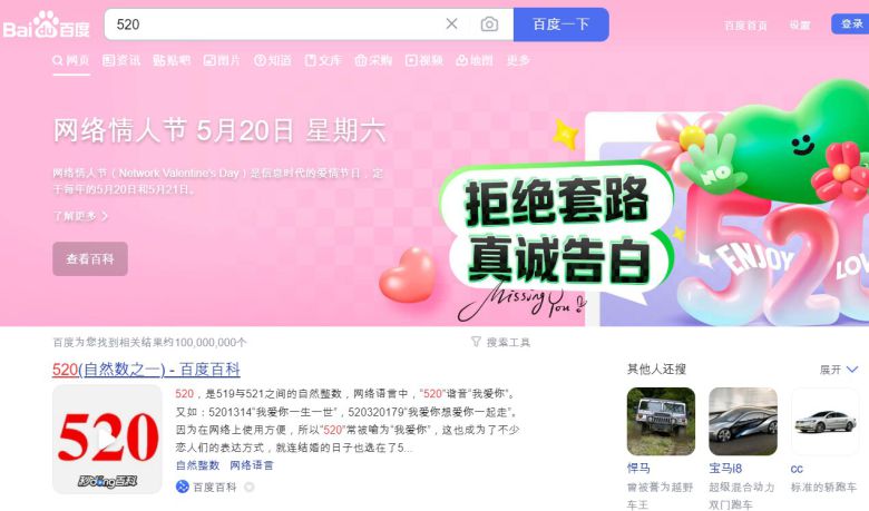 중국판 네이버인 '바이두'에 5월 20일을 검색하면 나오는 '520' 홍보 페이지. 중국에서 5월 20일을 뜻하는 '520'은 '사랑해'와 발음이 비슷해 연인의 날로 자리 잡았다./바이두 캡처 |