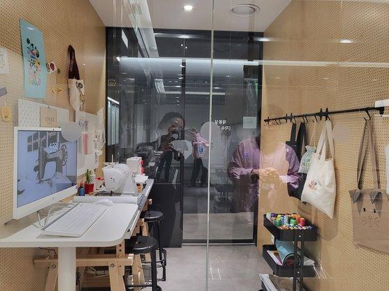 스튜디오에 들어가자마자 유리창으로 된 ‘워크룸’이라고 쓰인 곳이 보였는데요. 큰 작업 테이블 위에서 디자인한 옷들을 검수하는 작업이 한창이었습니다. 옷걸이에 걸린 옷들은 얼핏 봐도 멋스러워서 눈을 떼지 못했어요. 동대문점의 경우 2200평 공간에 약 900명의 입주사가 들어와 있다고 합니다.