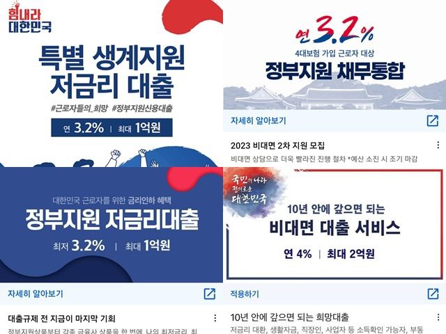 실제 SNS에서는 '특별 생계지원 저금리대출' '연 3.2% 정부지원 채무통합' '정부지원 저금리대출' '연 4% 비대면 대출 서비스' 등의 광고 문구를 쉽게 볼 수 있다. 해당 광고에는 태극 문양 로고나 청와대 이미지를 이용하고 '힘내라 대한민국' 등의 문구를 삽입하는 등 교묘하게 정부 지원인 것처럼 소비자를 속이고 있다. 링크를 클릭하면 정부 정책금융사업이 아닌 대부업체 또는 저축은행 대출을 권유하는 페이지가 나온다. 정부지원이라는 광고 문구와 달리 '지원금, 보조금이 아닌 대출서비스입니다'라는 안내 문구도 볼 수 있다. 아울러 이들이 사용하는 명칭은 국가기관과 비슷하지만, 인터넷에 검색해 보면 존재하지 않는 기관임을 알 수 있다.