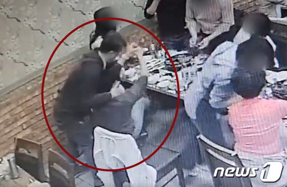 지난 10일 전남 순천의 한 식당 만찬장에서 더불어민주당 소속 박성호 시의원(붉은 원내 왼쪽)이 국민의힘 여시의원을 뒤에서 팔로 감싸는 모습이 식당 CCTV에 찍였다. ⓒ 뉴스1 |