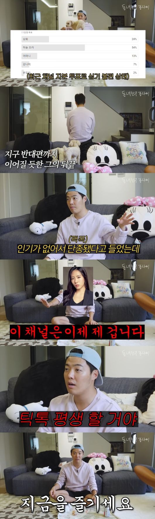 이날 강남은 제작진에게 "왜 왔어요?"라고 물었고, 제작진은 "공지 내용이 많다고 들어서"라고 말했다. 이에 강남은 "나 아니어도 되잖아"라고 까칠한 반응을 보였다. 알고보니 최근 진행했던 채널 지분 투표에서 조카 하늘(54%), 이상화(24%), 어머니(13%)의 뒤를 이어 강남은 7%의 득표밖에 하지 못했던 것. 이는 2%를 차지한 편집자를 제외하면 출연진 중에서는 가장 최하위였다.