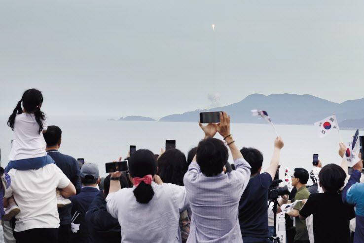 25일 오후 전남 고흥군 영남면 우주발사전망대에서 시민들이 실용위성을 싣고 우주로 향하는 누리호(KSLV-Ⅱ)를 지켜보고 있다. 이번 누리호 3차 발사는 차세대소형위성 2호 1기와 큐브위성 7기 등 본격적으로 실용급 위성을 탑재해 발사하는 첫 사례다. [연합]