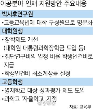 잠재력 있는 인재를 이공분야로 유입하기 위해 영재학교와 과학고 운영방식도 개선한다. 정부는 내년부터 영재학교 대상 성과평가를 시범 운영한다. ‘이공계 인재 양성’이라는 설립 목적에 맞게 운영한 학교에 포상을 주는 방안을 검토한다.