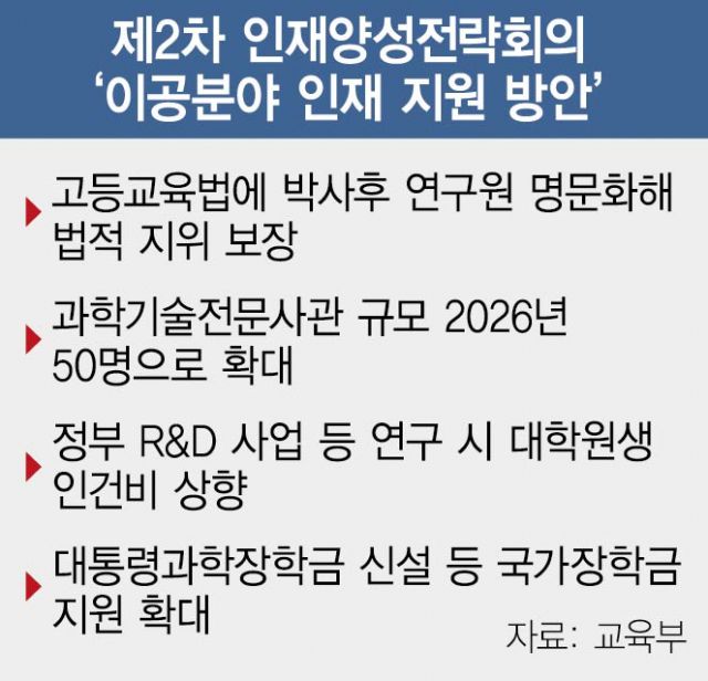 정부가 이공계 인재 양성을 지원하기 위해 박사후연구원(포닥)의 법적 지위를 보장한다. 이공계 석·박사생들의 인건비 제도를 개선하고 학부생에게만 지원됐던 대통령과학장학금을 신설하는 등 처우 개선에도 나선다.