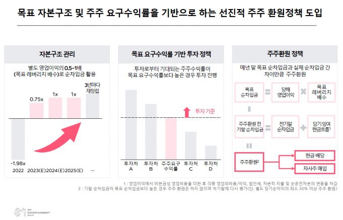 특히 목표 자본구조 및 주주 요구 수익률을 기반으로 하는 주주 환원정책 도입도 밝혔다. SM은 ▲별도 영업이익의 0.5~1배로 순차입을 활용하는 자본구조 관리 ▲투자로부터 기대되는 주주수익률이 목표 요구 수익률보다 높은 경우 투자를 진행하고 ▲매년 말 목표 순차입금과 실제 순차입금 간 차이만큼 주주환원을 이행할 방침이다 .