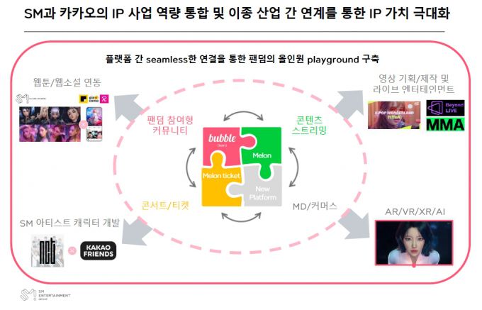 SM과 카카오는 팬덤플랫폼 디어유의 버블, 음원 스트리밍 서비스 멜론 및 멜론 티켓, 뉴 플랫폼을 중심으로 IP의 선순환 구조를 만들 계획이다.