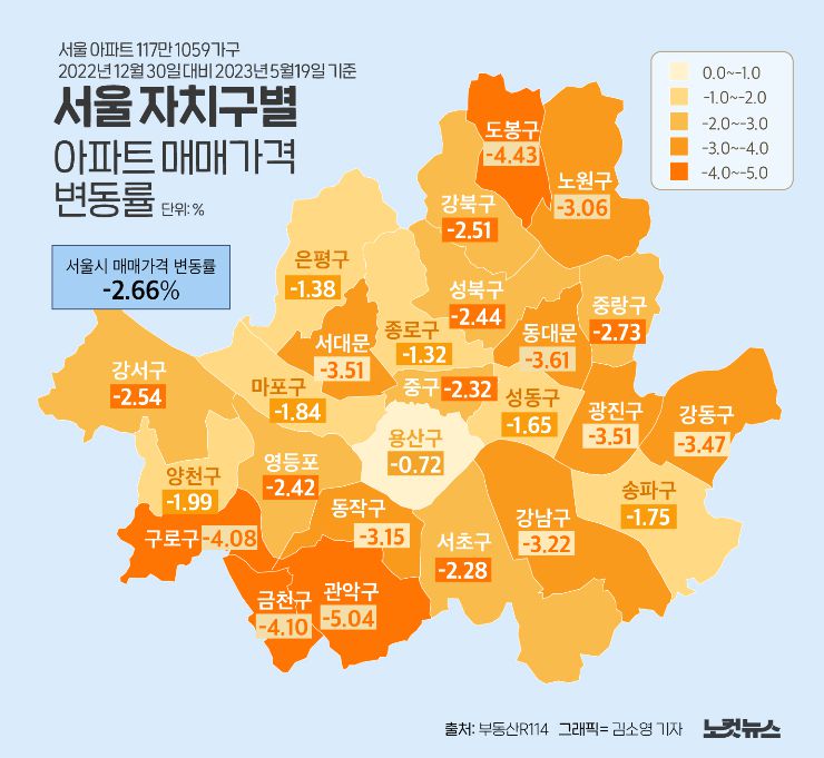 26일 부동산R114가 발표한 올해 5월 19일 기준 서울 아파트 매매가격 변동률은 지난해 말 대비 2.66% 떨어졌다. 자치구별로 보면 관악구(-5.04%)의 낙폭이 가장 컸고 도봉구(-4.43%), 금천구(-4.10%), 구로구(-4.08%) 등도 4% 이상 하락폭을 나타냈다.