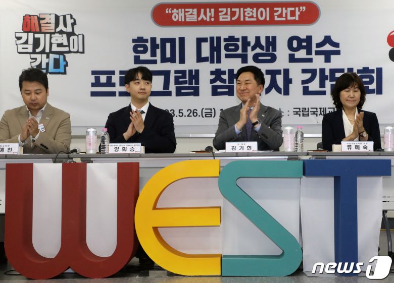 김기현 국민의힘 대표가 26일 오후 경기 성남시 분당구 국립국제교육원에서 열린 한미 대학생 연수프로그램(WEST) 참가자 간담회에서 박수를 치고 있다. 2023.5.26/뉴스1 ⓒ News1 황기선 기자 |