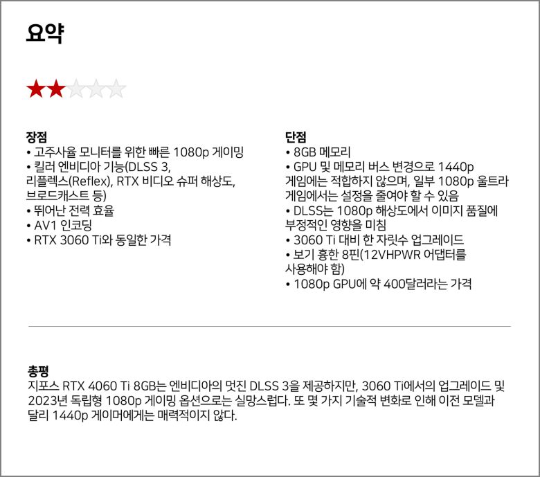 가령 지포스 RTX 4060 Ti가 399달러에 16GB 메모리를 제공하거나, 8GB 메모리를 제공하되 동일한 수준의 성능을 300달러 내지 325달러에 제공했더라면 매력적이었을 것이다. 하지만 현재로서는 엔비디아의 RTX 4- 시리즈 업그레이드는 잘해도 시시한 수준에 머물러 있으며, 이 GPU는 애석하게도 어중간한 위치에 속한다. 다른 제품을 알아보는 것이 좋겠다.