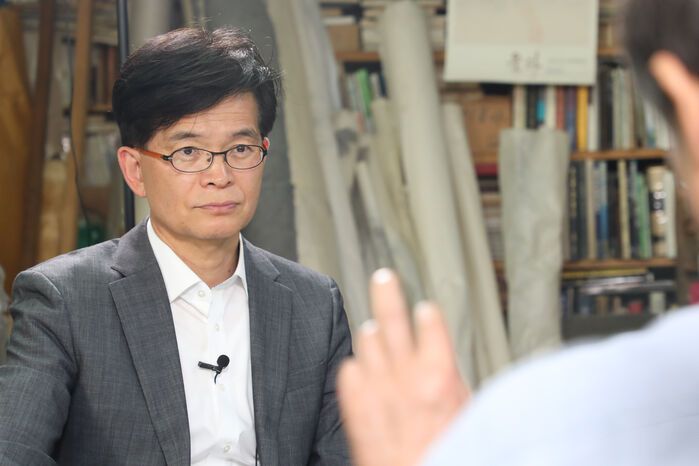 "그런 사진 없죠. 예술적 상상력으로 만들어 내야지. 딱 보는 순간에 아 이 사람의 전형성은 무엇일까? 그만이 도달한 정점은 어떤 것일까를 빨리 잡아 내야 돼요. 뭘 그릴 것인가. 성철을 통해서 지금 우리 사회에 던지고 싶은 거대 화두가 무엇일까를 되묻는 방식으로 접근을 했어요"
