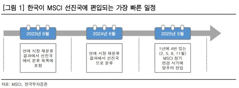 염동찬 한국투자증권 연구원은 “한국이 선진국에 편입되는 가장 빠른 스케줄은 올해 6월에 선진국 편입 후보 국가로 분류되고, 2024년 6월에 선진국 편입이 발표되고, 2025년 5월 분기 리뷰 결과가 반영되는 시점(5월 말 ~ 6월 초)에 실제 변경이 이루어지는 것”이라며 “아무리 빠른 스케줄을 적용하더라도, 실제 MSCI 편입까지는 2년 정도의 시간이 필요하다”라고 분석했다.