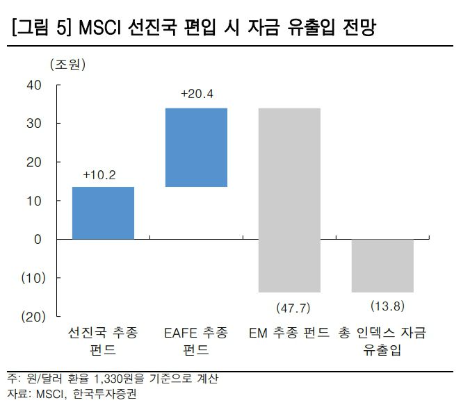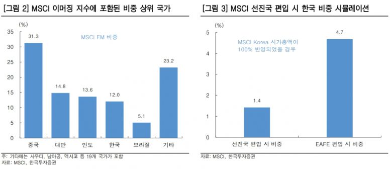 한국이 이머징 국가에서 선진국으로 이동하게 된다면 이머징 지수를 추종하는 자금은 한국 주식을 매도해야 하고, 선진국 지수와 EAFE 지수(북미 제외 선진국지수)를 추종하는 경우 한국 주식을 매수해야 하기 때문이다. 현재 한국이 이머징 지수에서 차지하는 비중은 12%이다. 선진국 지수로 이동할 경우 지수에서 차지하는 비중은 1.4%에 불과하며 EAFE에서는 약 4.7%를 차지하게 된다.