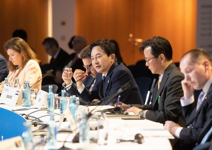 원희룡 국토교통부 장관이 25일(현지시간) 독일 라이프치히에서 열린 세계교통포럼(ITF) 교통장관회의 라운드테이블에 참석해 발언하고 있다. 국토교통부 제공 |