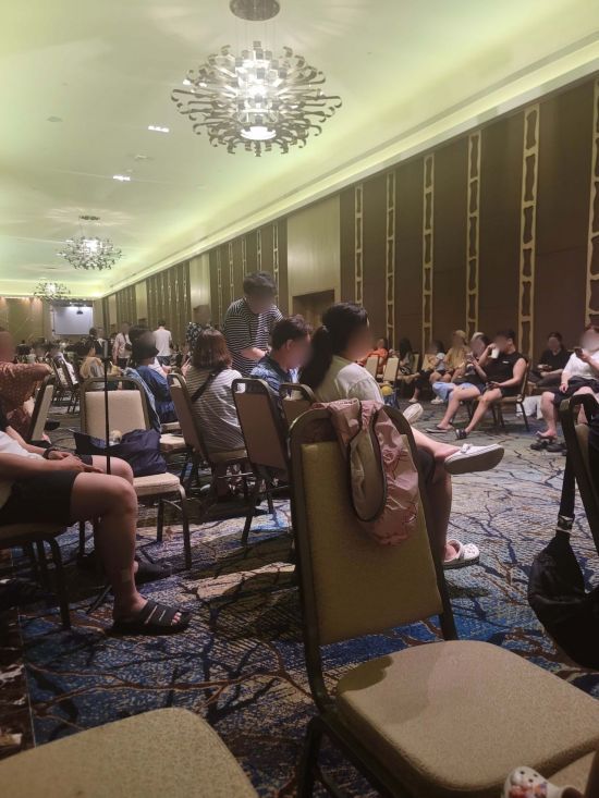 25일 괌의 한 호텔에서 태풍 마와르로 인해 객실로 들어가지 못한 한국인 관광객들이 호텔 연회실에 모여있다. [이미지출처=연합뉴스] |