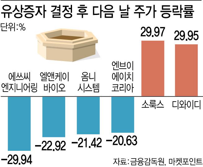 이외에도 옴니시스템(057540), 엔브이에이치코리아(067570) 등이 유상증자 결정한 후 다음 날 주가가 20% 넘게 하락한 것으로 집계됐다. 이달 옴니시스템과 엔브이에이치코리아는 각각 230억원, 300억원 규모의 유상증자 단행을 결정했다고 밝힌 바 있다.