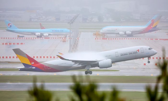 28일 오전 인천국제공항 활주로 위를 이륙하는 아시아나항공 소속 여객기 모습. 연합뉴스