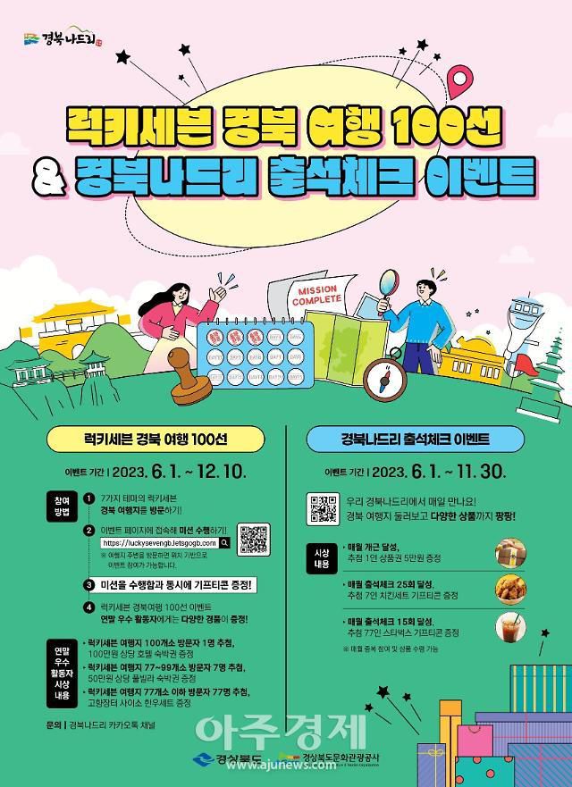 경북도와 경상북도문화관광공사는 오는 6월 1~12월 10일까지 경북나드리 홈페이지에서 도내 관광 명소 및 축제 100선을 지정해 ‘럭키세븐 경북여행 100선&경북나드리 출석 체크’ 이벤트를 실시한다고 28일 밝혔다.
