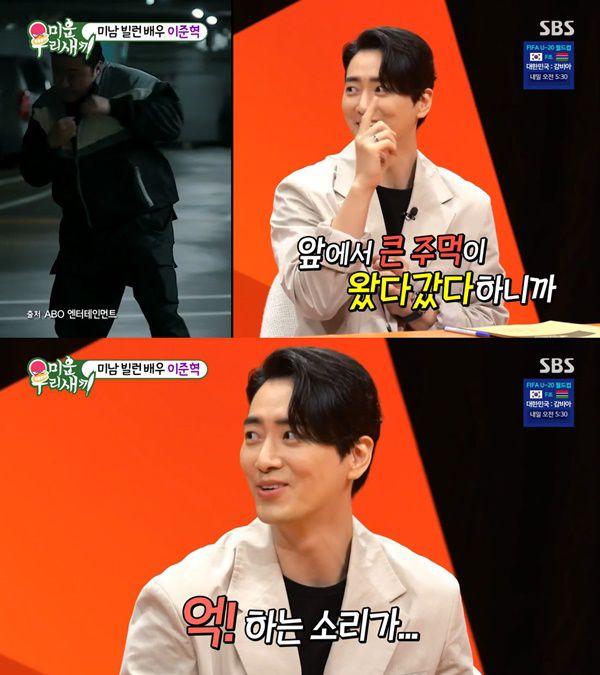 이에 대해 이준혁은 "보호대를 착용하고 맞아봤는데 처음 듣는 제 목소리를 들었다. '억' 소리를 냈다"고 웃음을 보였다.