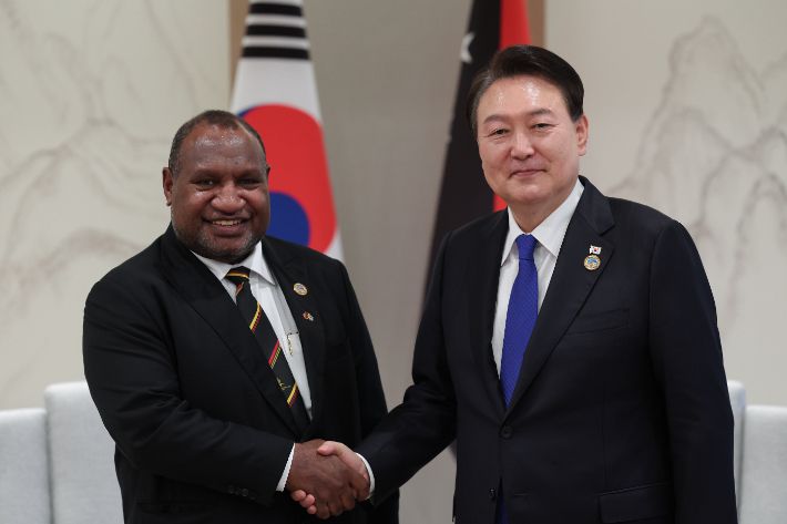 2023 한-태평양도서국 정상회의를 앞두고 윤석열 대통령이 28일 서울 용산 대통령실에서 제임스 마라페 파푸아뉴기니 총리와 정상회담을 갖고 있다. 대통령실 제공 |