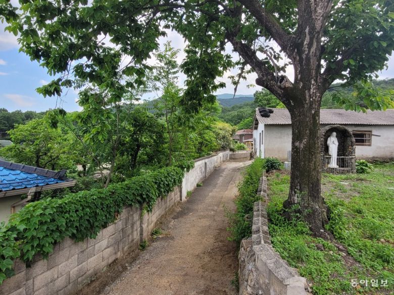 두 시간쯤 걸려 도착한 순정 공소는 나지막한 산 중턱에 자리한 작은 마을에 숨어 있었다. 한때 선교사들의 휴양지로 사용됐다고 알려졌는데, 흡사 제주도에 온 것처럼 좁은 길 사이로 이어진 돌담길이 무척이나 정겹다. 걸은 지 두 시간이 넘으니 왜 성당 관계자가 물을 챙기라고 했는지 알 것 같다. ‘가다 보면 중간에 편의점이 있겠지’ 하고 생각했지만 오산. 애타게 찾아도 끝내 편의점은 고사하고 구멍가게 하나 나타나지 않았다.