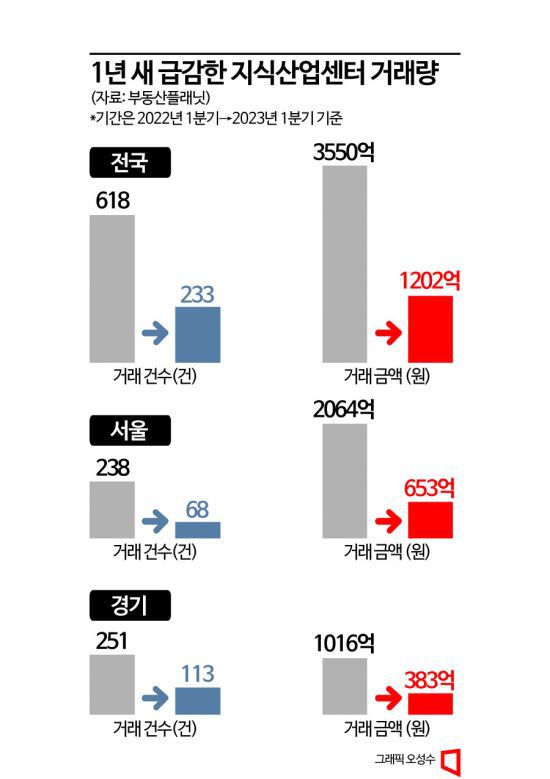 25일 상업용부동산 전문기업 부동산플래닛에 따르면 올해 1분기 전국 지식산업센터 매매 거래량은 233건으로 집계됐다. 이는 지난해 1분기(618건)와 비교하면 385건(62.2%) 줄어든 수치다. 거래금액도 같은 기간 3550억원에서 1202억원으로 2348억원(66.1%) 감소했다.