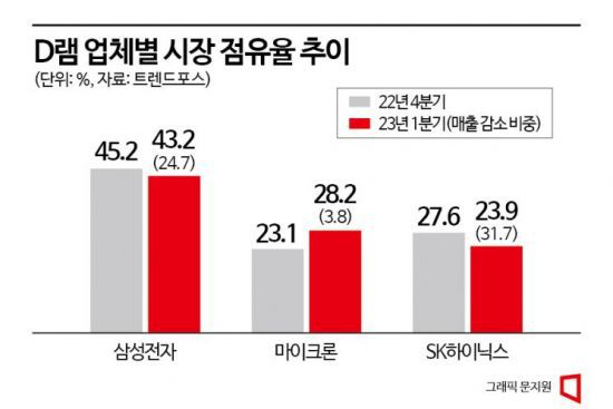 시장조사업체 트렌드포스가 발표한 통계를 보면, 1분기 삼성전자와 SK하이닉스는 전분기와 비교해 출하량과 매출이 줄면서 점유율도 떨어졌습니다. 반면 마이크론은 출하량을 늘리며 매출 감소 폭을 줄였고, 점유율도 높였습니다. 반도체 시장 침체 상황에서 어떻게 출하량을 늘린 걸까요?