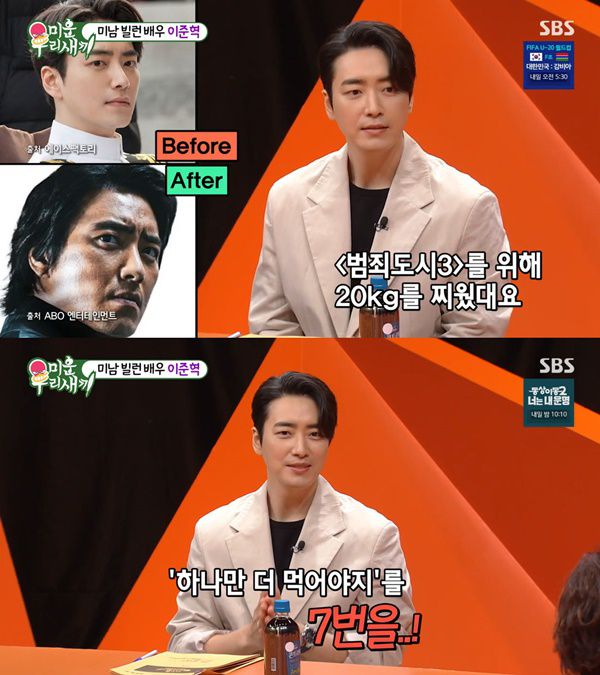 특히 마동석의 요청으로 20㎏를 증량했다는 이준혁은 "그냥 살만 찌우는 게 아니라 덩치를 같이 찌워야 하다 보니 6끼 정도 먹었다"고 설명했다.