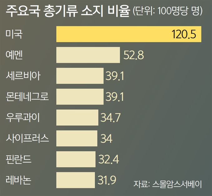 국제 무기조사 기관인 스몰암스서베이에 따르면 2018년을 기준으로 미국에선 총기 3억9000만정이 유통됐고, 인구 100명당 총기 소지 비율은 120.5%로 압도적 세계 1위다. 내전이 진행 중인 2위 예멘(52.8%)보다 두 배 높은 비율이다.