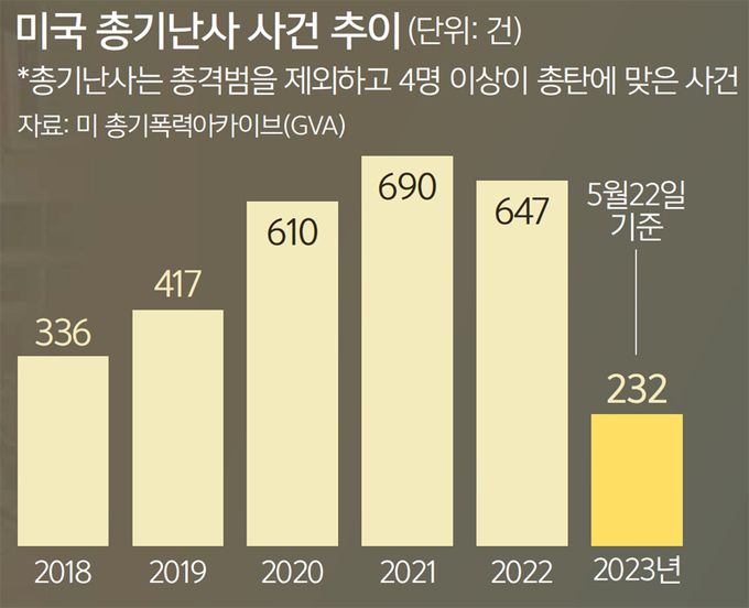 영국 BBC는 2019년 1월부터 2021년 4월까지 미국에서 750만명이 처음으로 총기 소유자가 됐다고 보도했고, 코로나19 사태를 계기로 총기 판매가 급격히 늘고 있다는 보도가 계속된다. 또 비영리단체 총기폭력아카이브(GVA)에 따르면 올해 1월1일부터 22일까지 미국 전역에서 232건의 총기 난사 사건이 발생해 302명이 숨지고 910명이 다쳤다.