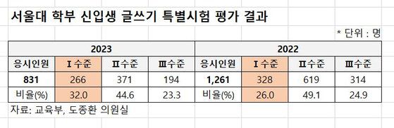 한편 서울대 신입생의 글쓰기 능력도 점차 낮아지는 것으로 나타났다. 올해 서울대 신입생 글쓰기 특별시험에서 총 응시생 831명 중 266명(32%)가 3단계 등급 중 가장 낮은 등급인 ‘Ⅰ수준’을 받은 것으로 나타났다. 지난해보다 6%포인트가 늘었다. 서울대에 따르면 I수준은 ‘일관성이나 명료성이 낮고 주어진 자료를 피상적으로 해석하는 경우가 있으며, 예상되는 반론을 고려하지 못하거나 반박의 설득력이 낮은 편’으로 평가된 글이다.