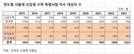 29일 서울대가 국회 교육위원회 소속 도종환 더불어민주당 의원에게 제출한 자료에 따르면, 2023학년도 신입생을 대상으로 수학 특별시험을 실시한 결과 응시 대상자 1624명 중 679명(41.8%)이 ‘기초수학’과 ‘미적분학의 첫걸음(미적분학)’ 수강 대상자로 분류됐다. 고급수학 대상자는 149명, 정규반 대상자는 796명이었다. 서울대는 2015학년부터 특별시험 성적으로 신입생을 네 개 반으로 나눠왔는데, 기초수학과 미적분학 수강 대상자는 고교 수학 교과내용에 대한 이해도가 부족한 것으로 평가된 학생들이다.
