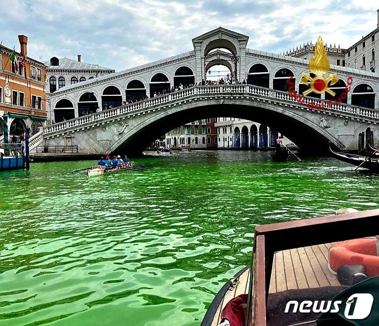 (서울=뉴스1) 권진영 기자 = '물의 도시' 이탈리아 베니스의 운하가 온통 형광 초록색으로 변했다.