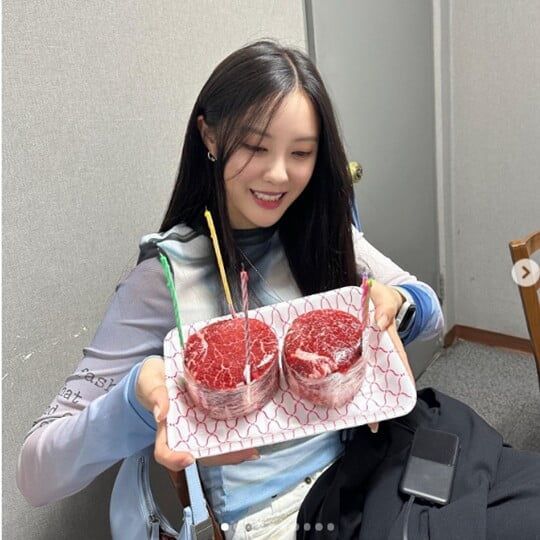 함께 공개한 사진 속에는 소고기 안심 주변으로 초를 꼽아 만든 케이크를 들고 있는 효민의 모습이 담겼다. 효민은 독특한 케이크에도 환한 미소로 기뻐하고 있어 보는 이들까지 웃음 짓게 한다.