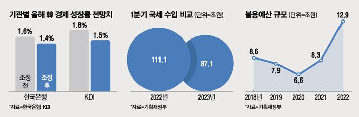 다만 2분기 이후에도 세수 확보에 난항이 이어진다면 추경 편성 논의를 피하기 어려울 것으로 보인다. 주요 기관의 올해 경제 성장률 전망이 차례로 악화한다는 점을 봐도 하반기에는 경기가 되살아날 것이라는 정부 입장에 변화가 생길 가능성이 크다.